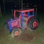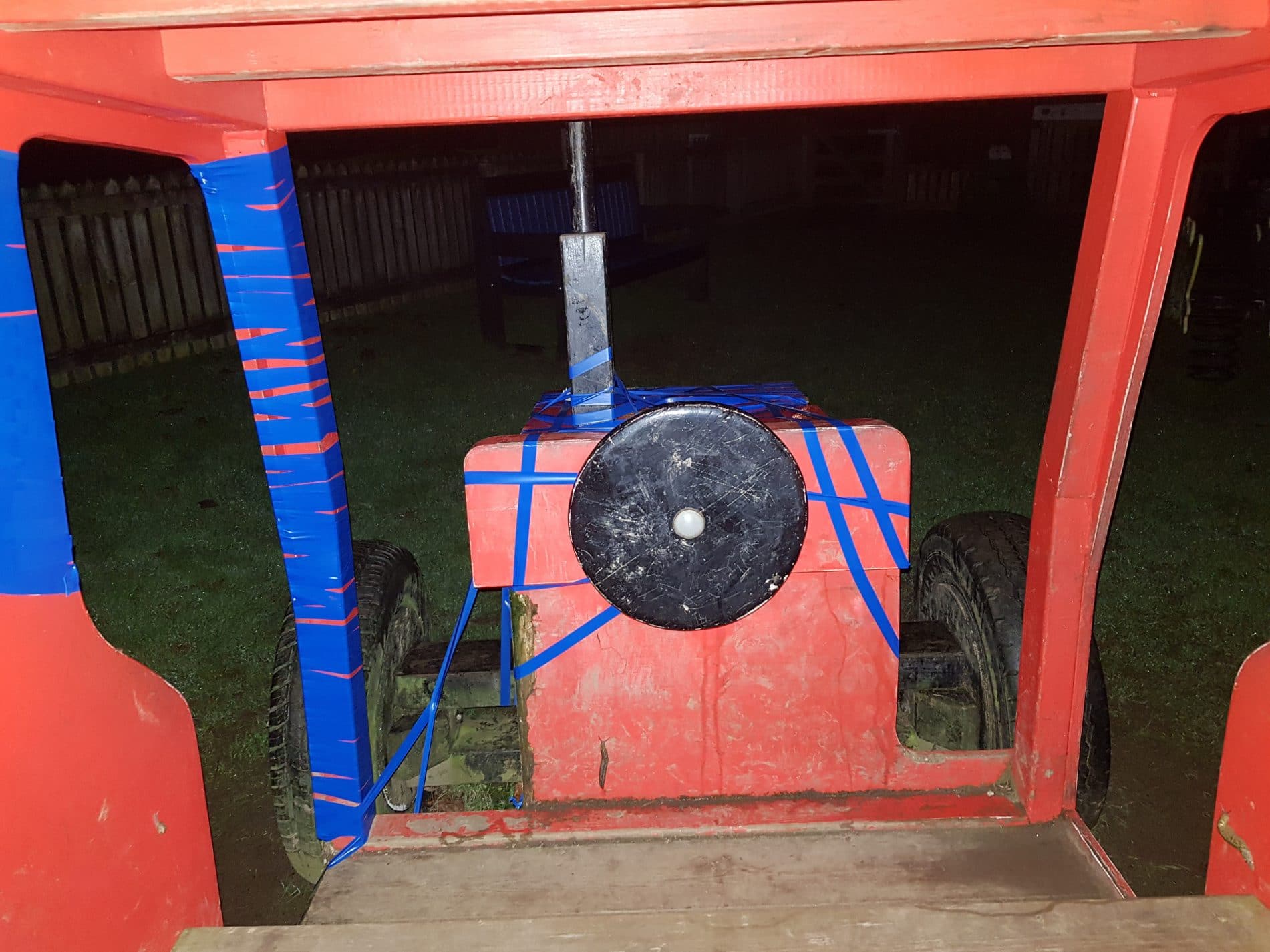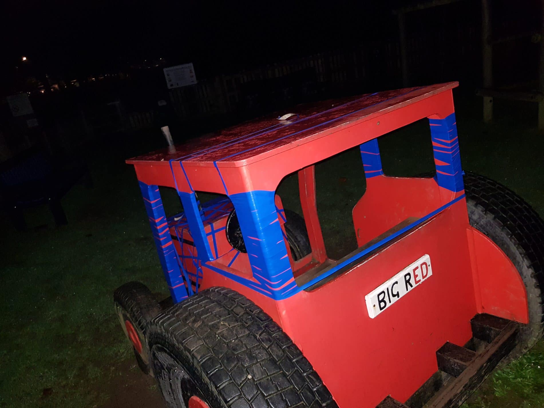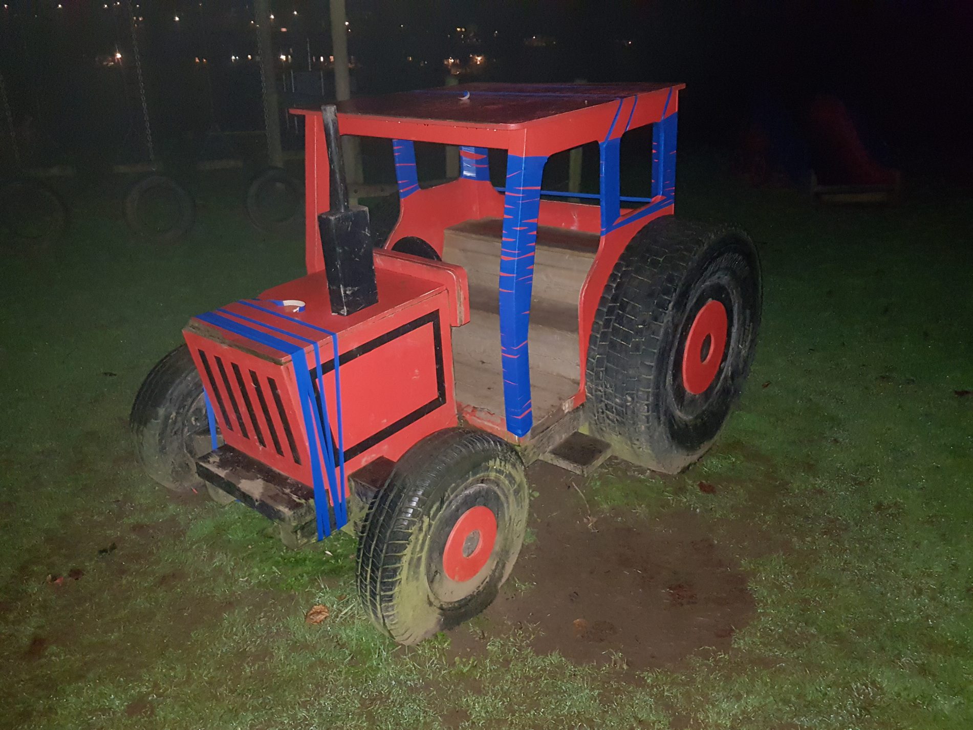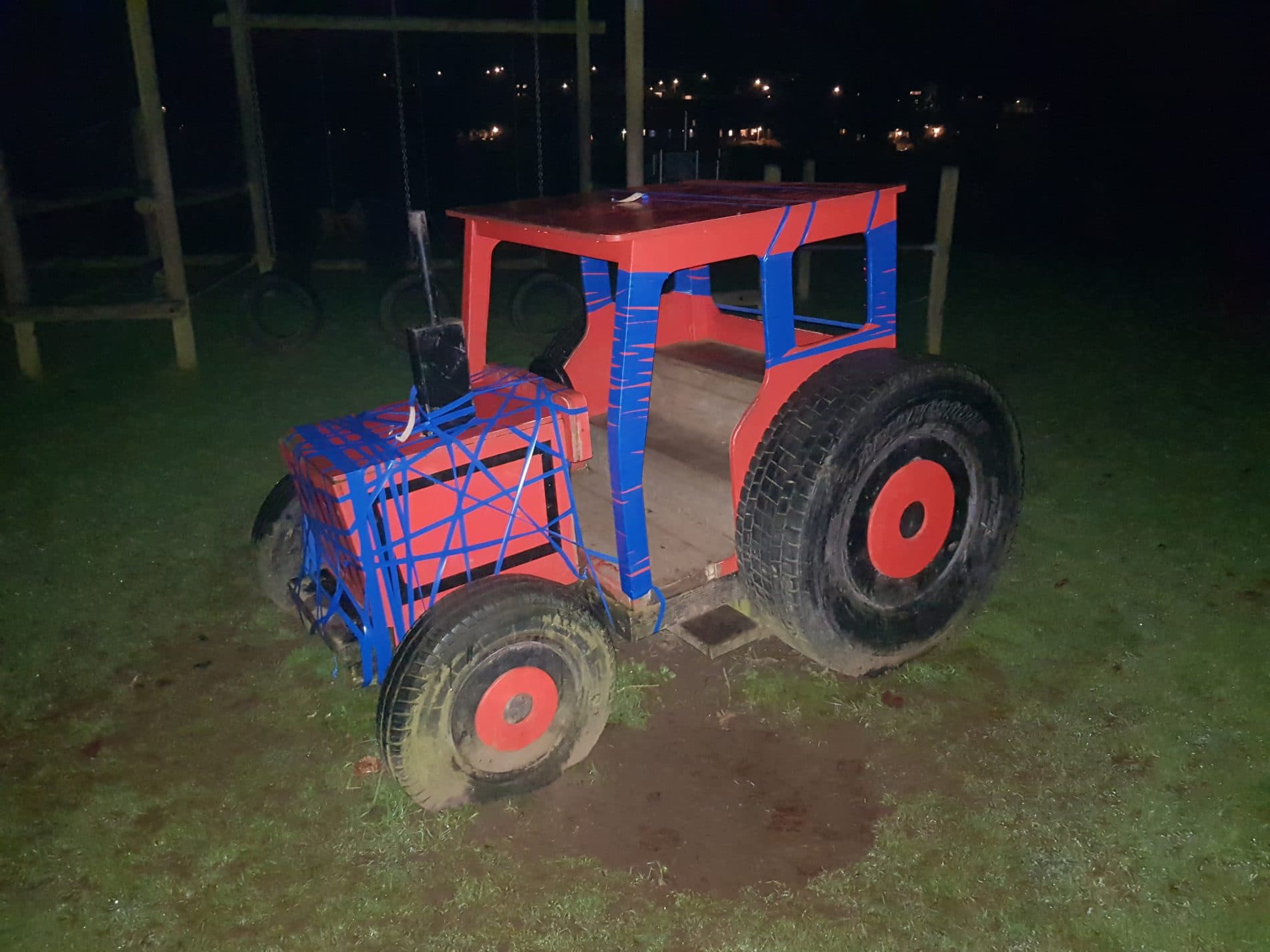 In Wadebridge, Cornwall, there is a mock Red tractor in a childrens play park. The Red Tractor is now partly Blue. It has been wrapped with Blue insulation tape.
