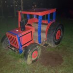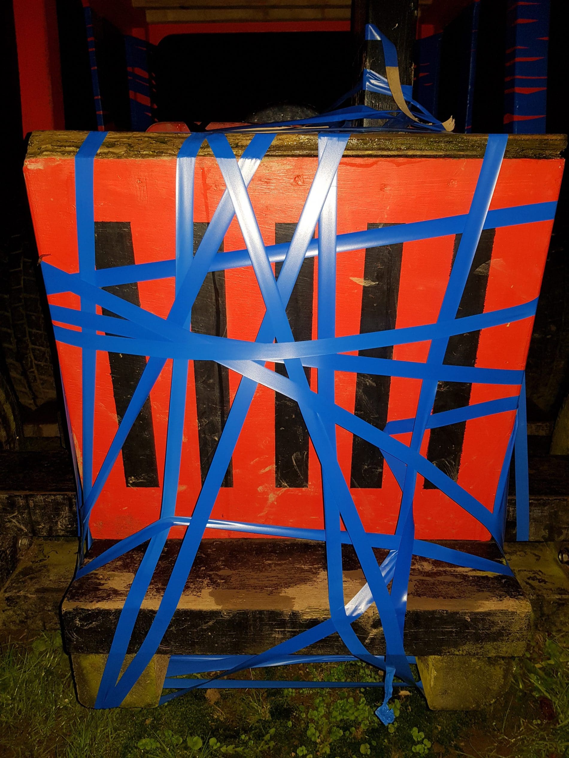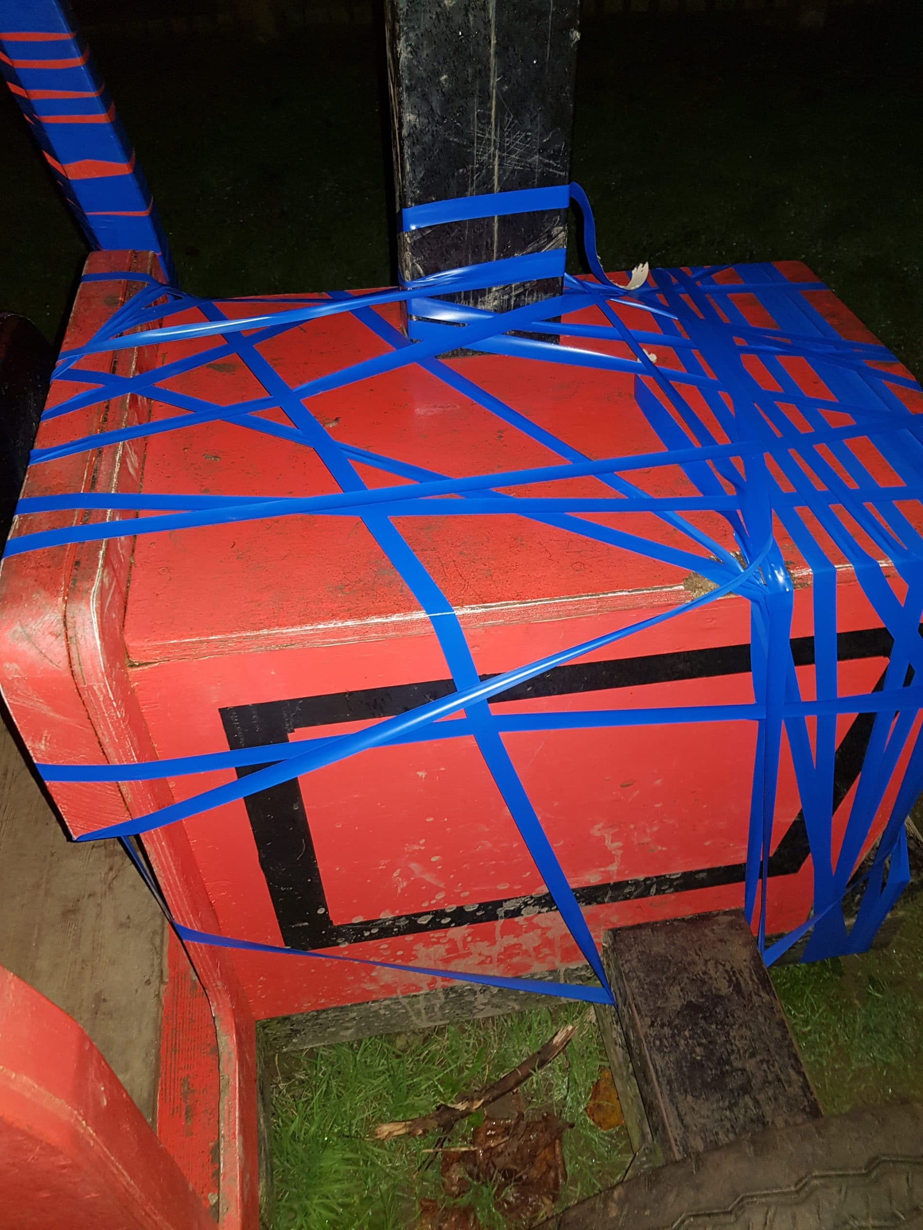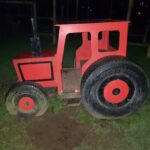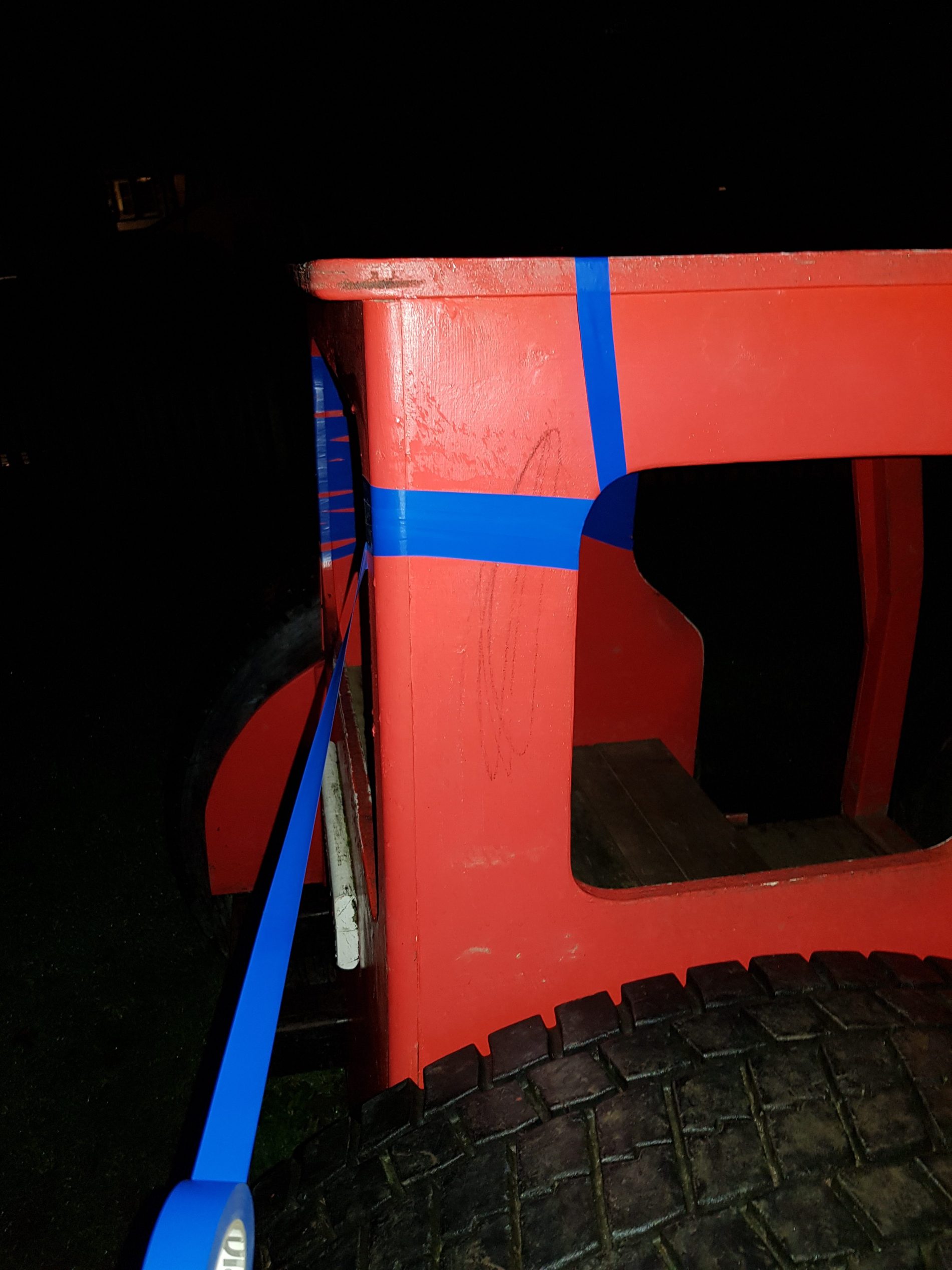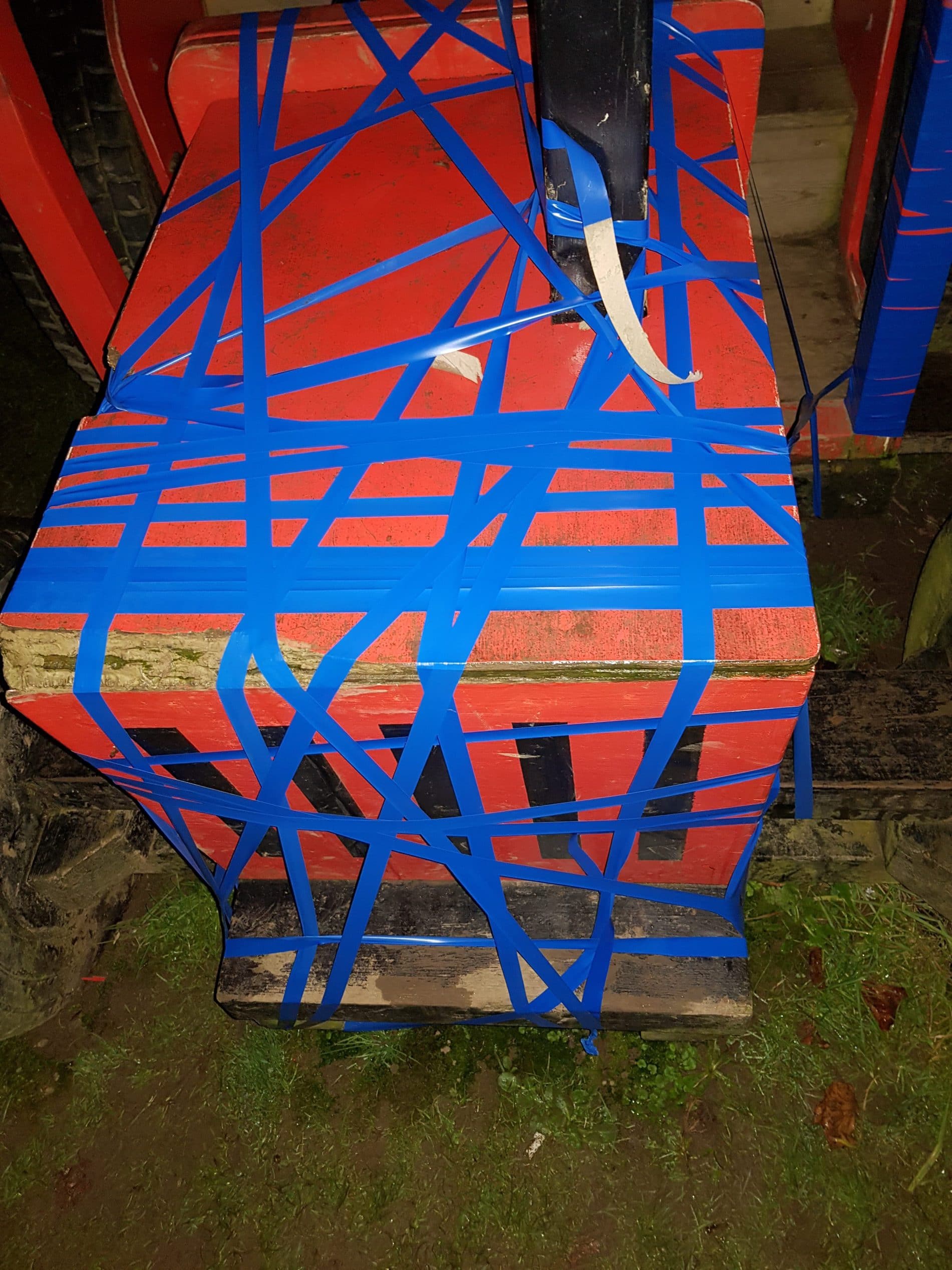 In Wadebridge, Cornwall, there is a mock Red tractor in a childrens play park. The Red Tractor is now partly Blue. It has been wrapped with Blue insulation tape.